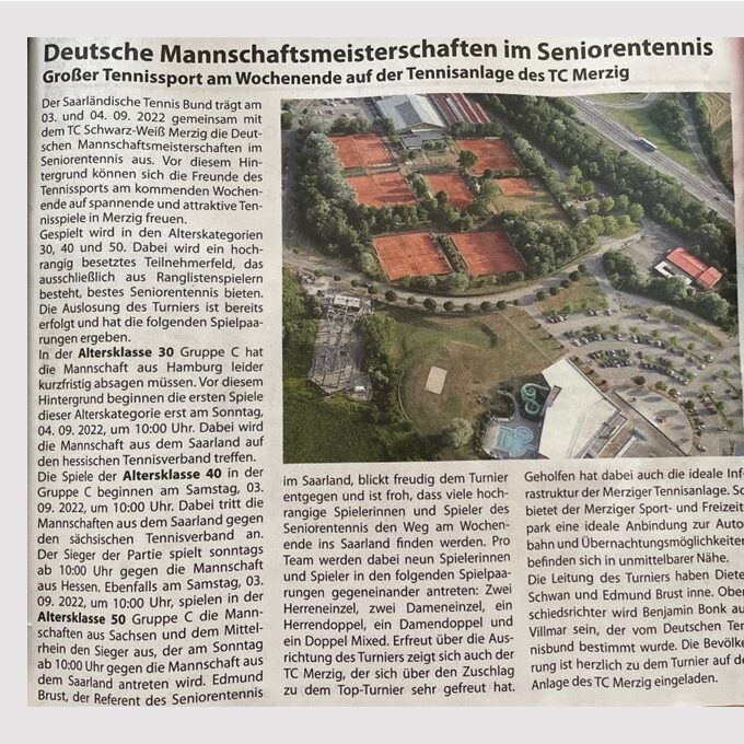 TOP News – Turniere:SPITZENTENNIS in Merzig 03.09-04.09.22! ♦ Auch in diesem Jahr freuen wir uns, die dt. Mannschaftsmeisterschaften der Klasse C auf unserer schönen Anlage des Tennisclub Schwarz-Weiss Merzig ausrichten zu dürfen. Es werden für die Altersklassen 30, 40 und 50 die Mannschaftsmeister der Landesverbände Sachsen, Mittelrhein, Hessen und Saarland ermittelt. Wir dürfen ein weiteres…