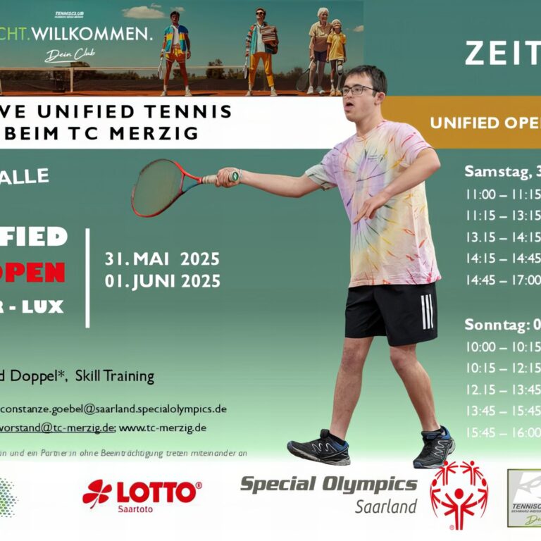 TENNIS FÜR ALLEEin Weltranglisten Turnier in MERZIG ! vom 26. Mai bis zum 01. Juni 2025 Bild Christof Göbel, Special Olympics Tennisspieler UNIFIED OPEN SAAR-LOR-LUX: Inklusionsturnier der Special Olympics auf der Tennisanlage des TC Merzig. Am 31. Mai und 01. Juni 2025 findet auf der Tennisanlage des TC Merzig das UNIFIED OPEN SAAR-LOR-LUX statt – ein Inklusionsturnier…