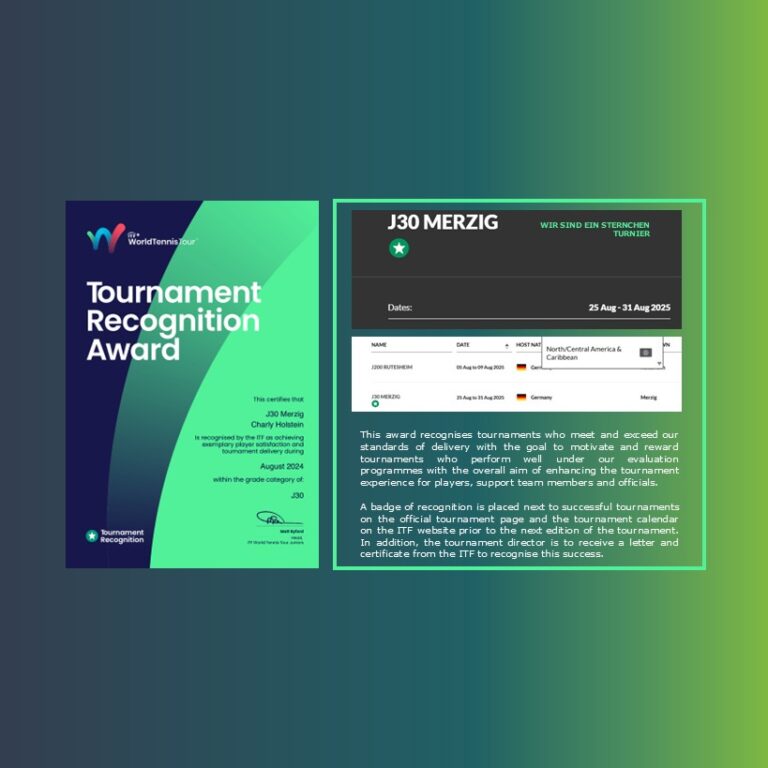 TC Merzig erhält ITF AWARD 2024 für herausragende Turnierorganisation. Ein Turnier mit Sternchen * Die Turnierorganisation des TC Merzig, vertreten durch Turnierdirektor Charly Holstein, wurde mit einer ganz besonderen Auszeichnung geehrt: Für die erfolgreiche Ausrichtung des ITF Juniors 2024 erhielt der Verein den begehrten ITF AWARD 2024. Mit dieser Auszeichnung zählt das Turnier nun offiziell zu…