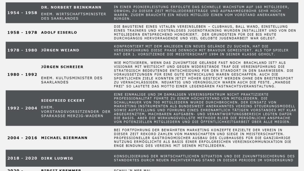 Im Erreichten zeigt sich die Handschrift der jeweiligen Vorstände. Sie haben den Verein professionell, engagiert und verantwortungsvoll in die jeweils nächste Epoche geführt. Für ihre erfolgreiche Arbeit gebührt ihnen unser aller Dank und Anerkennung.